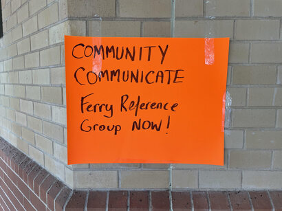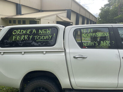 Long time Daintree resident Lawrence Mason and around nine or so other locals, including business owners held placards and utilised strategically positioned posters to reiterate the message the region needs a concrete reliable option, whether it be a new ferry or a bridge.