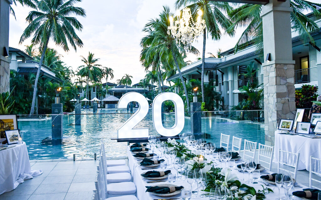 The evening started with a beautiful scene as a long, elegant dining table stretched toward the center of the resort, ending at the large glowing “20” numbers that served as a bright beacon for two decades of memories.