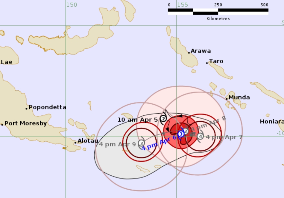 At 4pm on Monday, April 6, the Bureau indicated Severe Tropical Cyclone Maila, 37U, is currently located in the Solomon Sea. The steering influences are balanced and Maila is expected to be slow moving over the Solomon Sea before moving west southwest by Thursday.