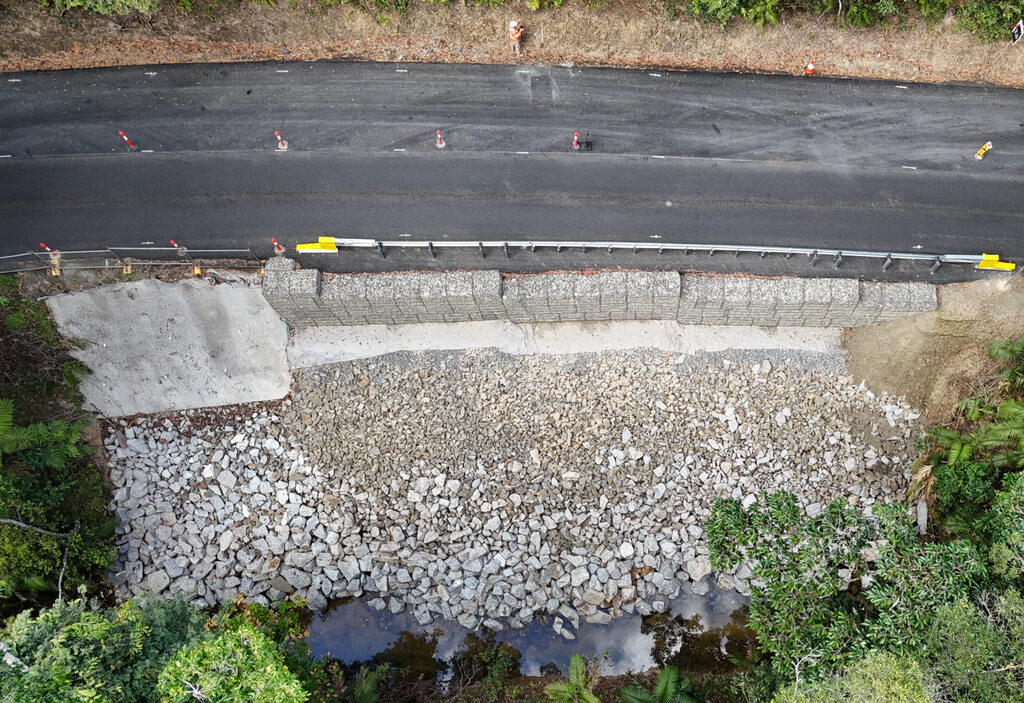 Between Saddle Mountain Road and Streets Creek, stabilisation works are underway at two upslope sites, with a single-lane section moving between sites.