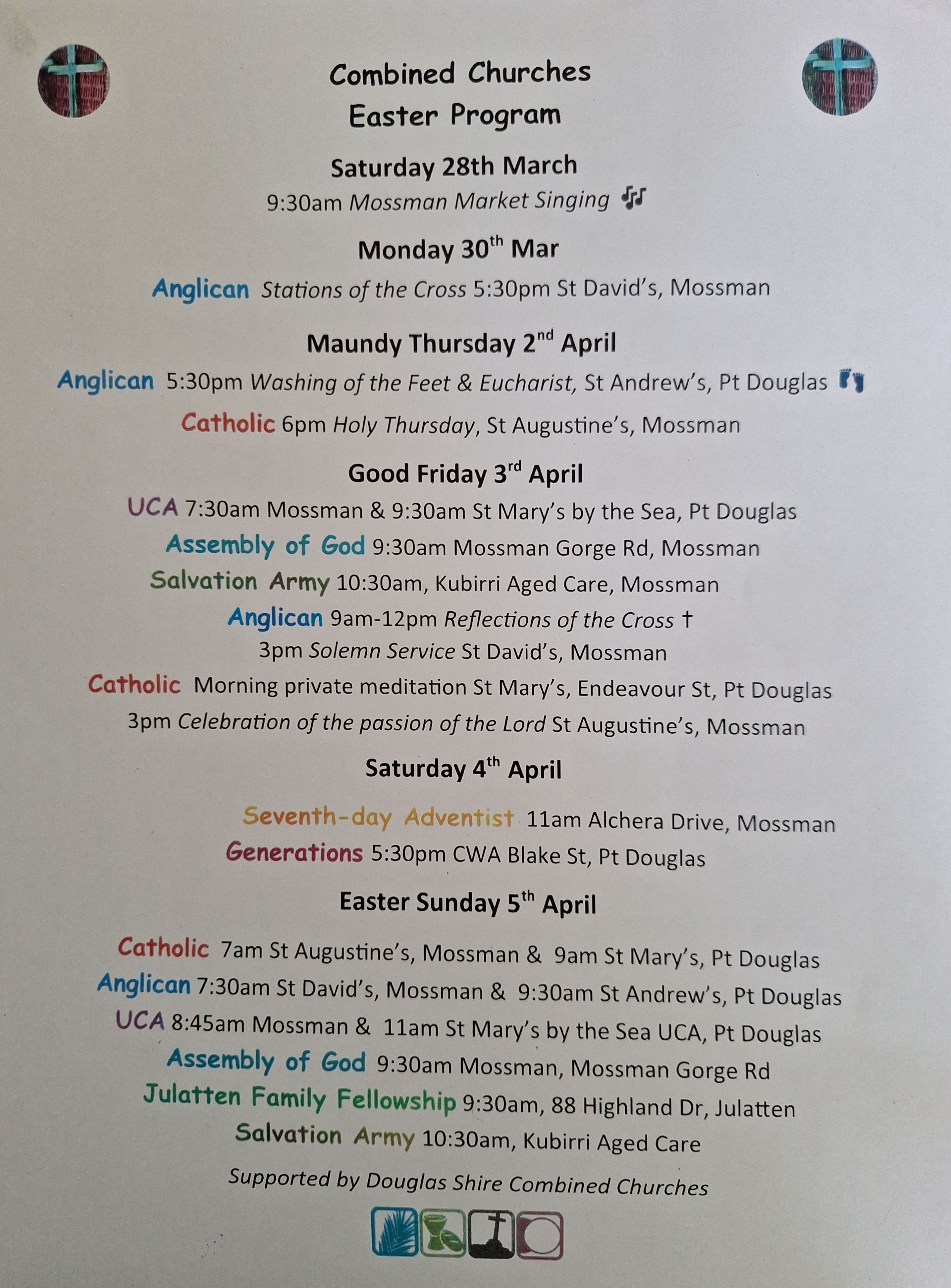 COMBINED CHURCHES EASTER PROGRAM Martine Plumbe 0408 774091 | 12.03.2026 15:02 | Martine Plumbe | [email protected] | ||