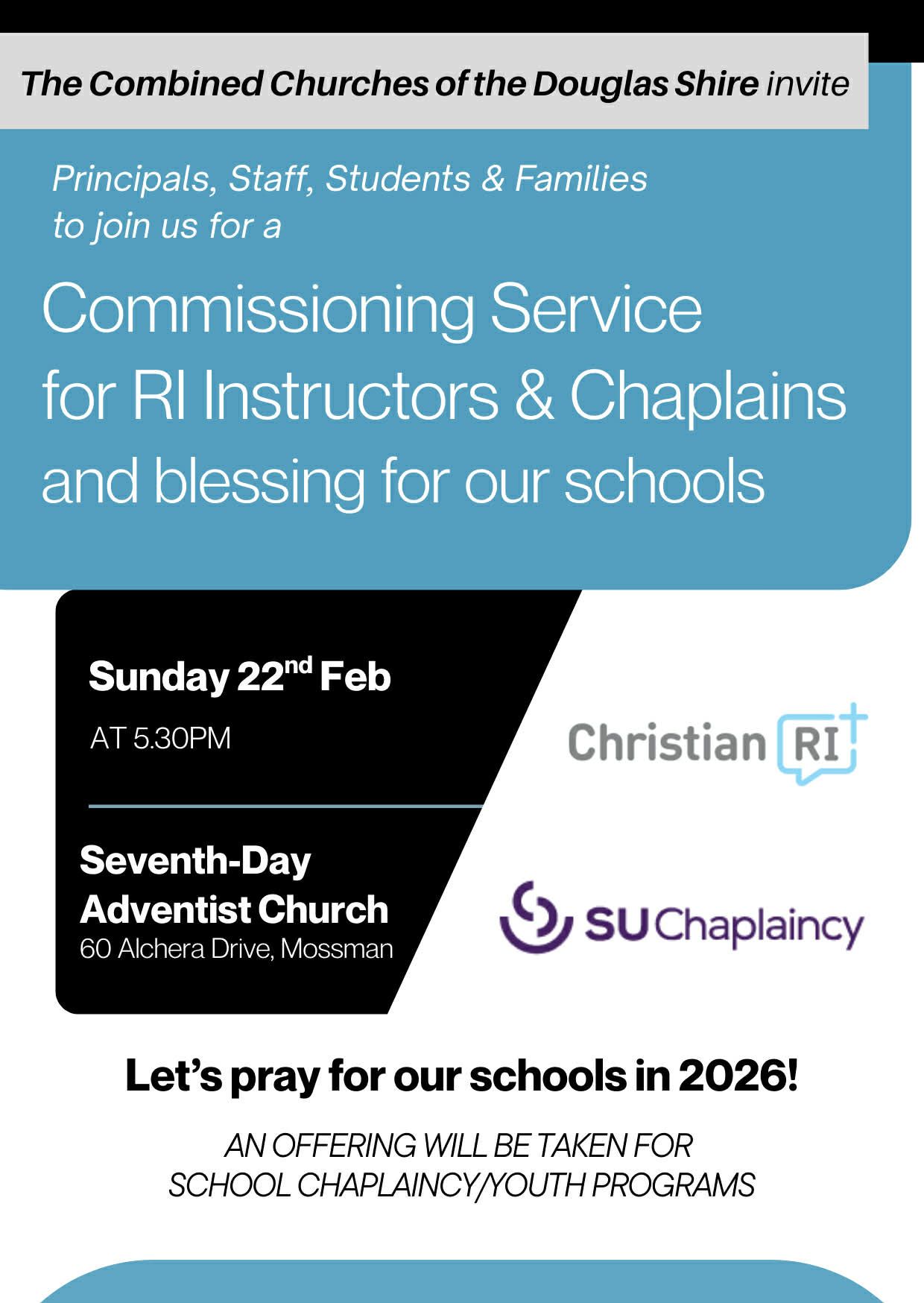 COMMISSIONING SERVICE FOR RI INSTRUCTORS & CHAPLAINS Sunday 22nd Feb Douglas Shire Combined Churches invite you to the Seventh-Day Adventist Church, Alchera Drive, Mossman to bless our schools and families. This is followed by a light supper. Contact: 0408 774091 | 17.02.2026 12:08 | Martine Plumbe | [email protected] | ||