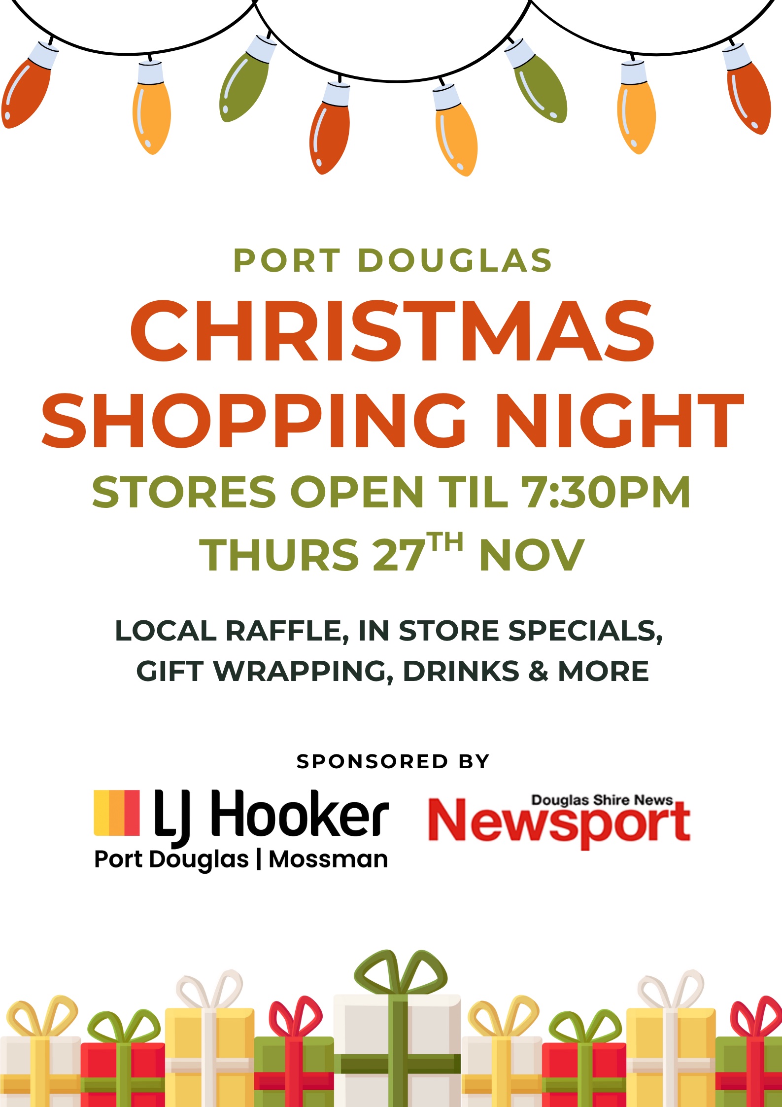 PORT DOUGLAS SHOPPING NIGHT Thursday 27th November - Stores open til 7:30pm Join us for a festive night of late night shopping with stores open until 7:30pm, offering a raffle, discounts, specials, gift wrapping, music, drinks and more.It’s the perfect chance to get your Christmas shopping sorted while supporting local businesses. Every $20 spent = 1 ticket into the GRAND DRAW! Winner announced at 8pm via @maker_portdouglas Instagram Story Participating stores: Maker Port Douglas Sea Gallery The Daintree Shop Floral Edge Whileaway In Port Shoes Splish Splash The Book Lounge Portobella L’Dream Premium Footwear Ngarru Gallery Tshinta Steep Martinique Island Style With Sugar Wicked Willies Coffee Works The Borboletta Boutique | 06.11.2025 15:19 | Maker Port Douglas | [email protected] | ||